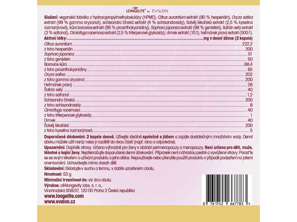 Složení: veganská tobolka z hydroxypropylmethylcelulózy(HPMC), Citrus aurantium extrakt (90 % hesperidin), Oryzasativa extrakt (99 % gamma oryzanol), schisandra čínská extrakt (4 % schisandrosidy), šalvěj lékařská extrakt (2,5 % kyselina rozmarýnová), kůra borovice extrakt (95 % proanthokyanidiny), Sophora japonica extrakt (98 % genistein), šafrán setý extrakt (3 % safranal), Cimicifugaracemosa extrakt (2,5 % triterpenové glykosidy), drmek extrakt (10:1), heřmánek pravý extrakt (500:1).